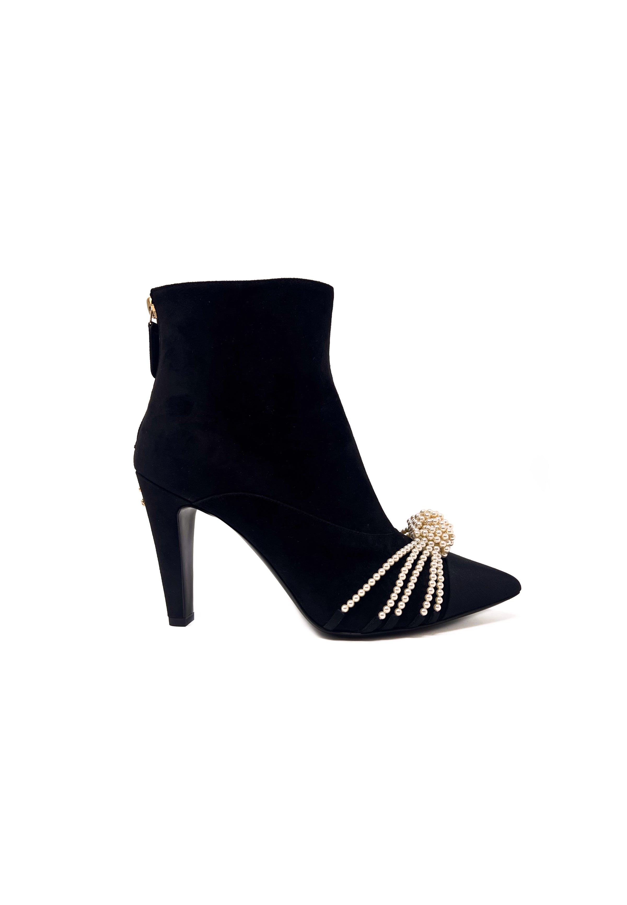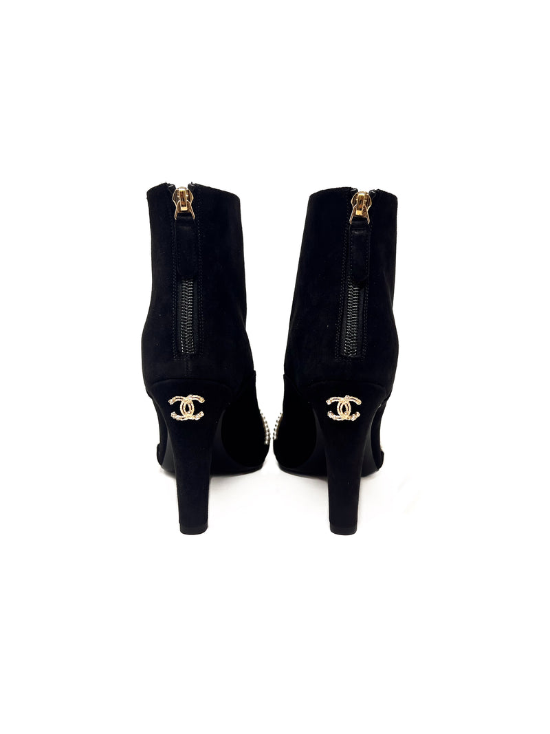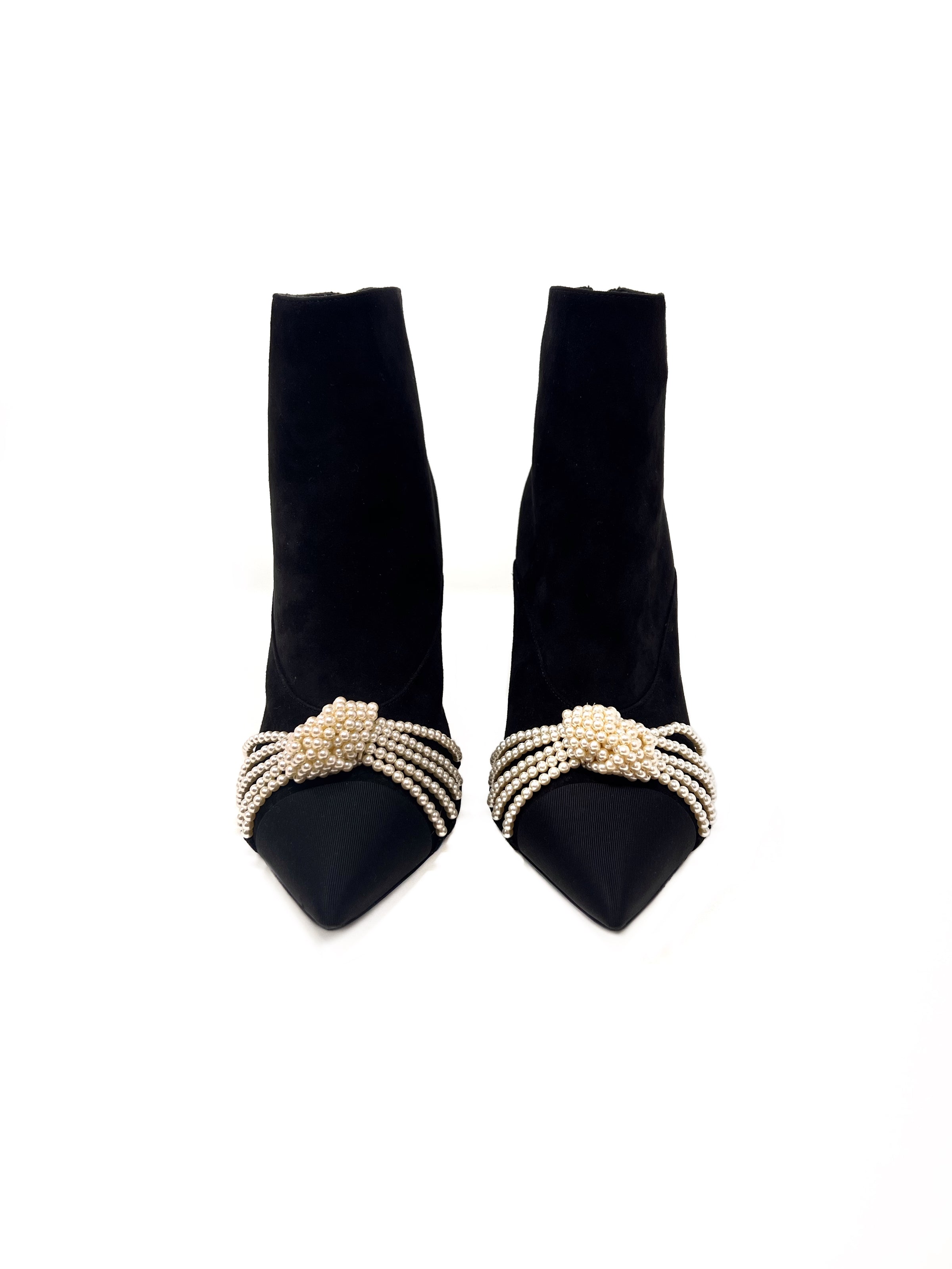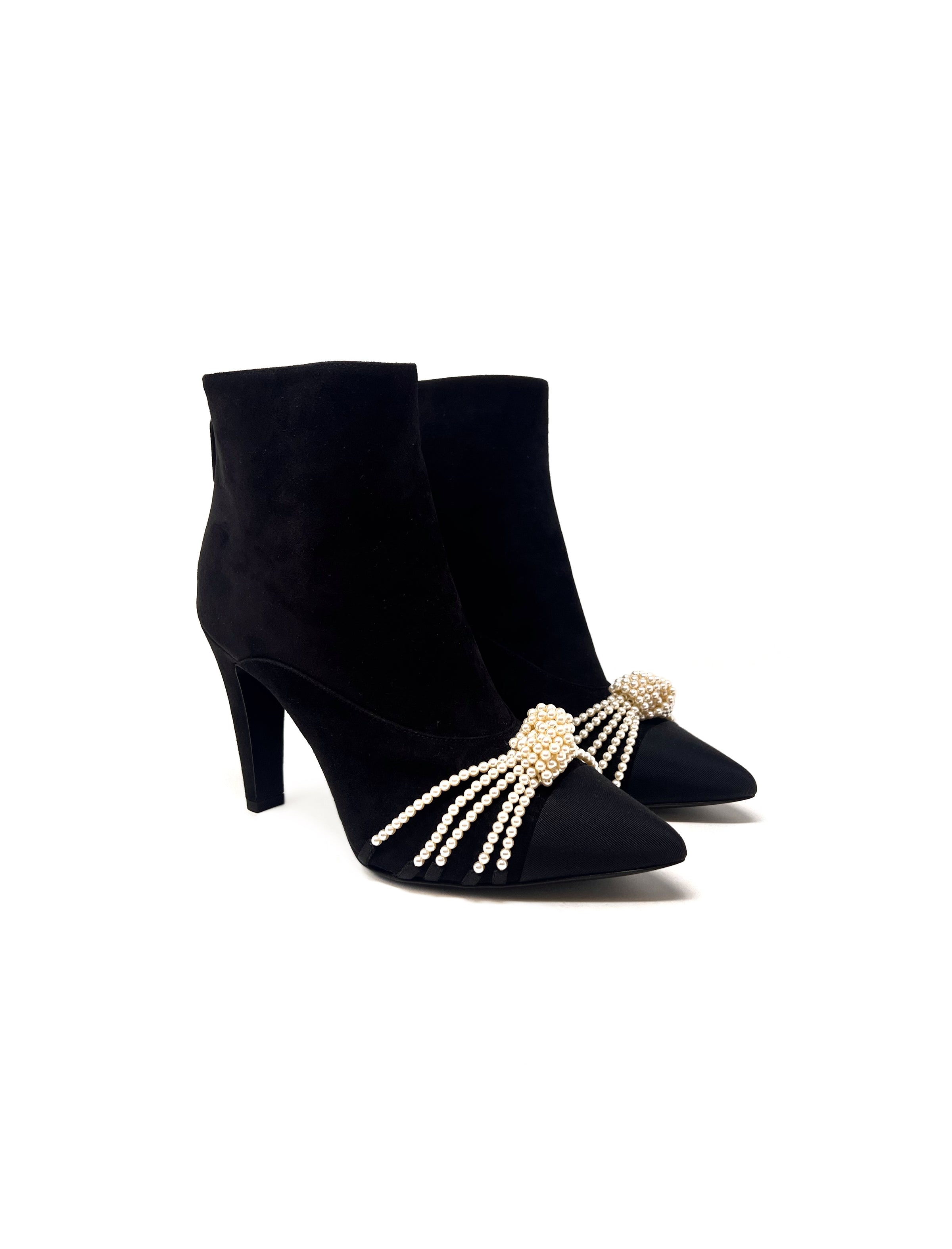 WB! '20A Suede Grosgrain Cap-Toe Pearl Knot Embellished Bootie